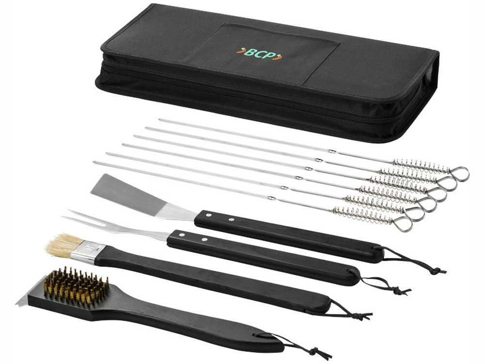 Набор для барбекю «Asado» из 11 предметов. Набор для барбекю включает лопатку для рыбы, кисть, вилку и щетку для очистки с деревянными ручками, шесть шампуров и чехол на молнии с передним карманом для нанесения. Нанесение не предлагается на отдельные элементы набора. Нержавеющая сталь и полиэстер 600D. Гравировка (CO2 лазер) (Без чернения) на данный товар осуществляется бесплатно. Оплачивается только настройка оборудования в размере 1000 рублей на весь тираж.