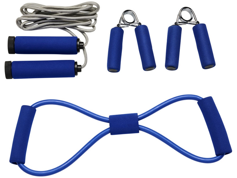 Набор для фитнеса «Dwayne» содержит весь спортивный инвентарь, необходимый для полноценной тренировки. Два кистевых эспандера, скакалка и грудной эспандер в соответствующем цветовом исполнении. Для удобной переноски поставляется в сетчатом мешочке, на котором можно сделать нанесение. Полиэстер. Тампопечать (1 цвет (цветные изделия)) на данный товар осуществляется бесплатно. Оплачивается только настройка оборудования в размере 4000 рублей на весь тираж.