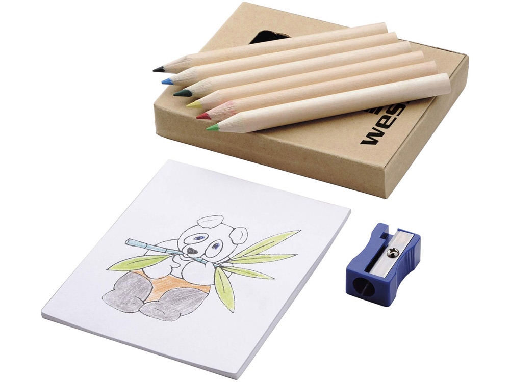 Оригинальный набор для рисования будет отличным промо-сувениром для любой акции креативного направления. Также отлично подойдет для продвижения дизайнерской студии. В наборе 6 цветных карандашей, точилка и раскраска. Комплект упакован в картонную коробку. Тампопечать (1 цвет (цветные изделия)) на данный товар осуществляется бесплатно. Оплачивается только настройка оборудования в размере 4000 рублей на весь тираж.