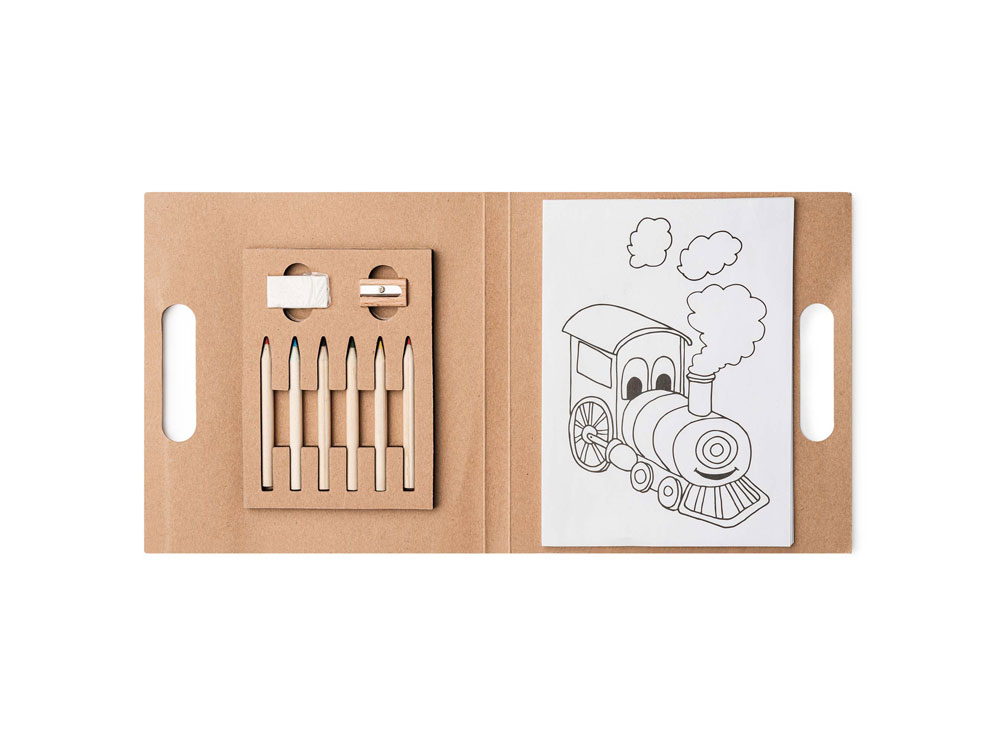 Детский набор для рисования. В комплекте блокнот для рисования, 6 цветных карандашей, точилка и ластик.