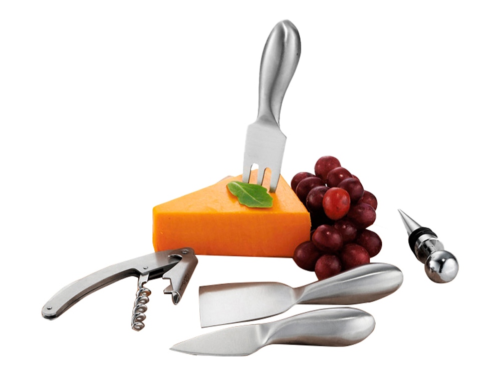 Набор для сыра и вина Mino. В этот набор из 5-ти предметов входит три ножа для мягкого сыра, твердого и зрелого сыра, стоппер для вина и штопор. Набор предлагается в деревянной подарочной коробке с шильдом 40 х 25 мм для лого. Гравировка (CO2 лазер) (Без чернения) на данный товар осуществляется бесплатно. Оплачивается только настройка оборудования в размере 1000 рублей на весь тираж.