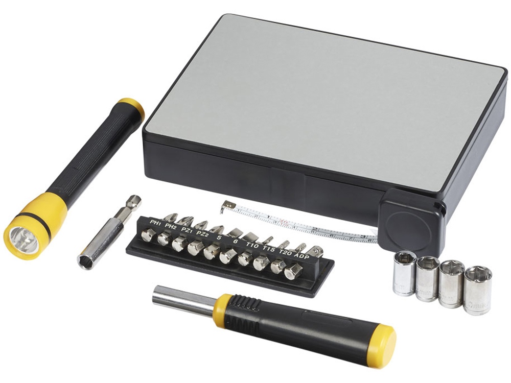 Набор инструментов от “Stac” включает 18 предметов. В набор входит 1 светодиодный фонарик, измерительная лента длиной 1 м, отвертка с магнитным удлинителем, 1 торцевой гаечный ключ и 4 головки гаечных торцевых ключей (7/8/9/10), набор из 9 бит для шуруповерта (PH, PZ, плоский и Torx). Коробка закрывается на магнитную крышку. Гравировка (оптоволоконный лазер) (Без чернения) на данный товар осуществляется бесплатно. Оплачивается только настройка оборудования в размере 1000 рублей на весь тираж.