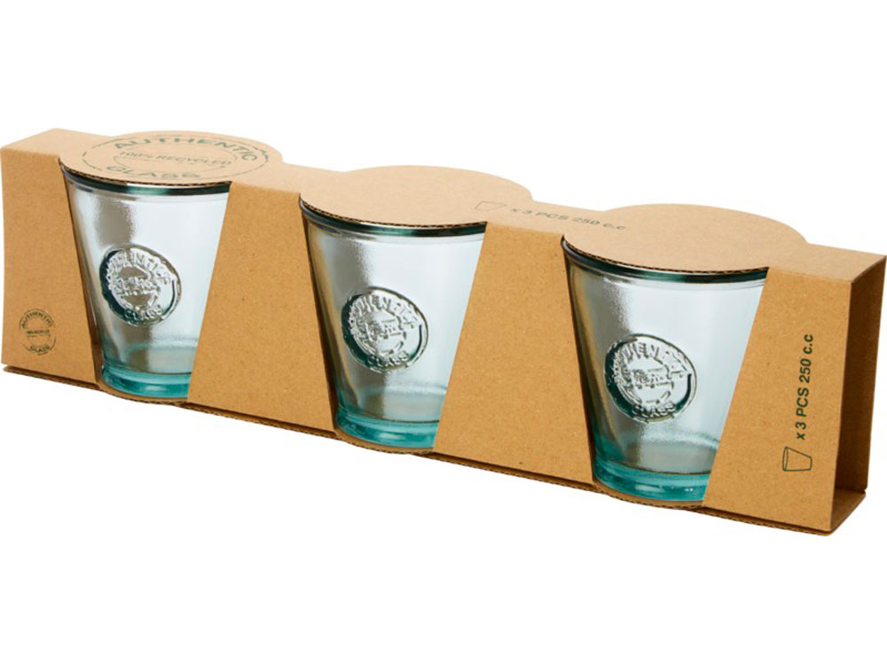 Набор из 3 стаканов объемом 250 мл. Эти стаканы изготовлены из переработанного стекла, а на создание этого комплекта потрачена 1 стеклянная бутылка. Переработанное стекло не отличается ничем по качеству от обычного, но при этом является более экологичным, ведь на изготовление этого материала тратится меньше энергии, сырья и примесей. Размер стакана: высота 9 см, диаметр 9 см.