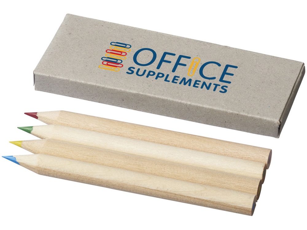 4 цветных карандаша в бумажной коробке. Толщина грифеля 2 мм. Тампопечать (1 цвет (цветные изделия)) на данный товар осуществляется бесплатно. Оплачивается только настройка оборудования в размере 4000 рублей на весь тираж.