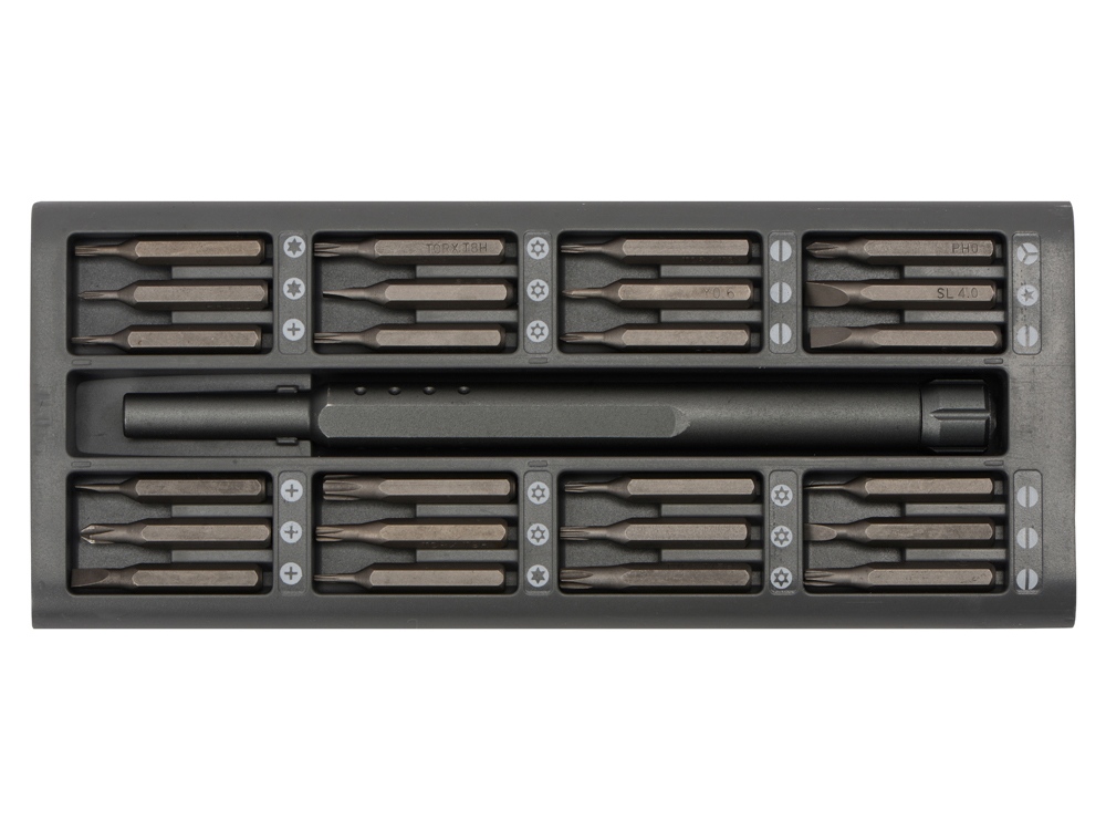 Набор из 24 насадок в металлическом кейсе. Насадки изготовлены из долговечной стали S2, твердость HRC 58-6. Включает наиболее распространенные и востребованные комплектующие для ремонта мобильных телефонов, планшетов, ноутбуков, игровых приставок и других электронных устройств. Гравировка (оптоволоконный лазер) (Без чернения) на данный товар осуществляется бесплатно. Оплачивается только настройка оборудования в размере 1000 рублей на весь тираж.
