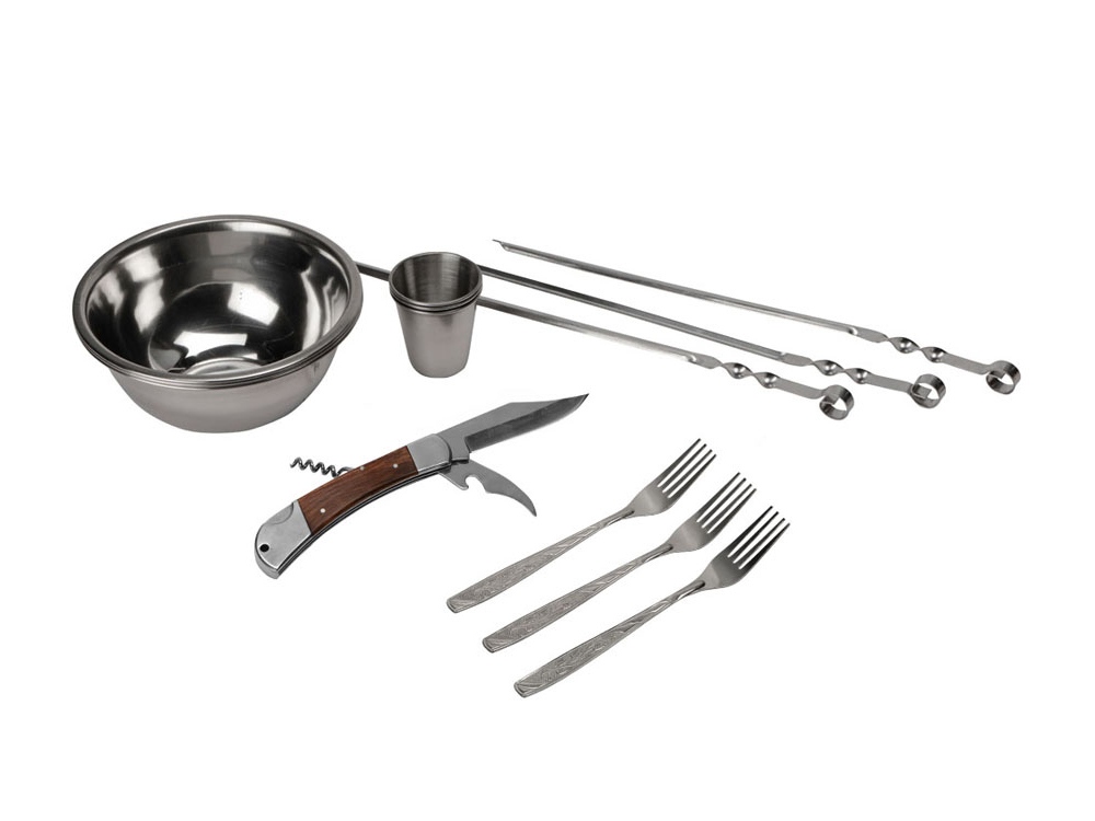 | Комплектность | шампур- 3шт, миска 500мл- 3шт, вилка- 3шт, стопка 70мл- 3шт, нож многофункциональный |