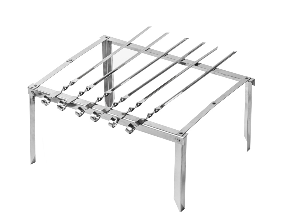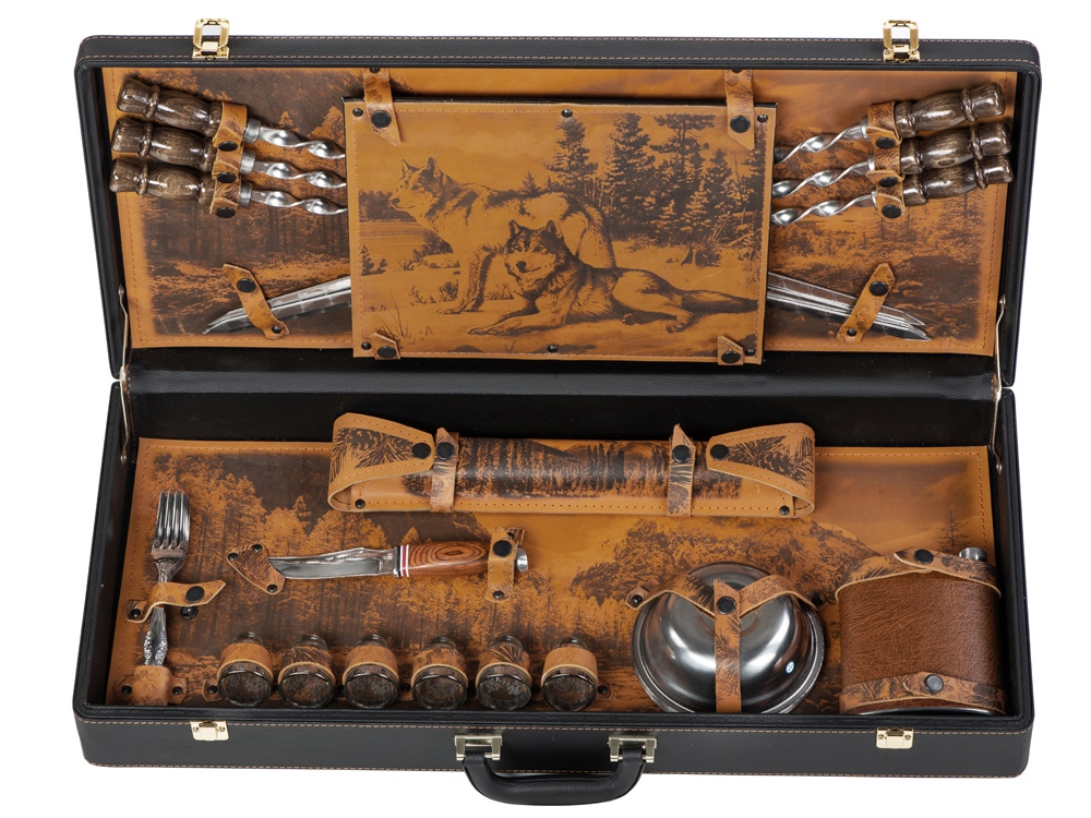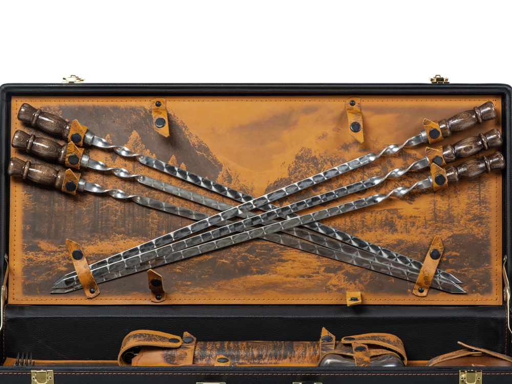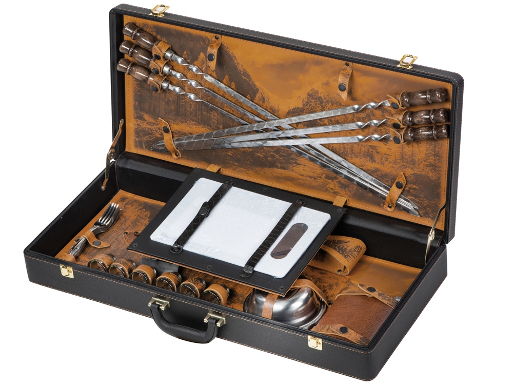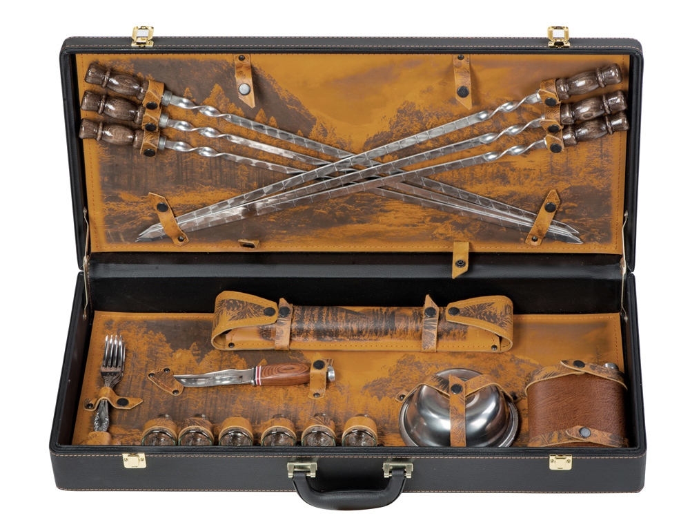 | Комплектность | шампура большие- 6 шт, доска разделочная, вилка- 6 шт, нож, стопка- 6 шт, тарелка- 6 шт, фляга, шампура мленькие- 6 шт, мангал |