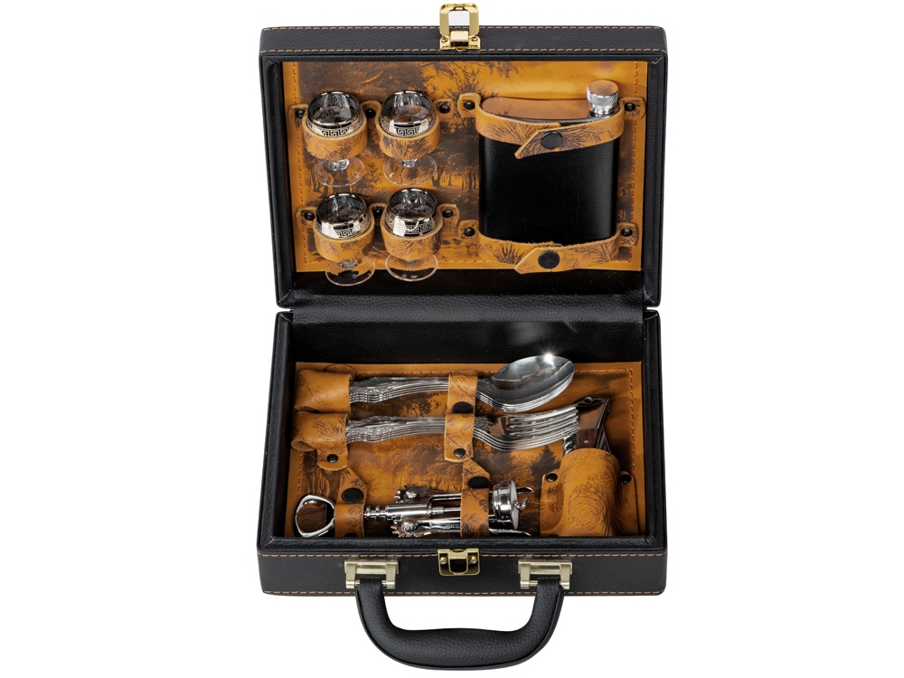 | Материал товара | дипломат- сплит-кожа/натуральная кожа, стопки- хрусталь, фляга, ложки, вилки, штопор- нержавеющпя сталь, нож- нержавеющая сталь/дерево |