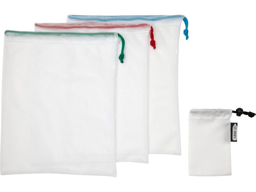 Набор из 3 сетчатых сумок из вторичного ПЭТ. Сумки многоразового использования, их можно использовать для фруктов и овощей как альтернативу пластиковым пакетам. У всех сумок есть затягивающий шнурок. Переработанный PET пластик. Термотрансфер (1 цвет (белые изделия)) на данный товар осуществляется бесплатно. Оплачивается только настройка оборудования в размере 5800 рублей на весь тираж.