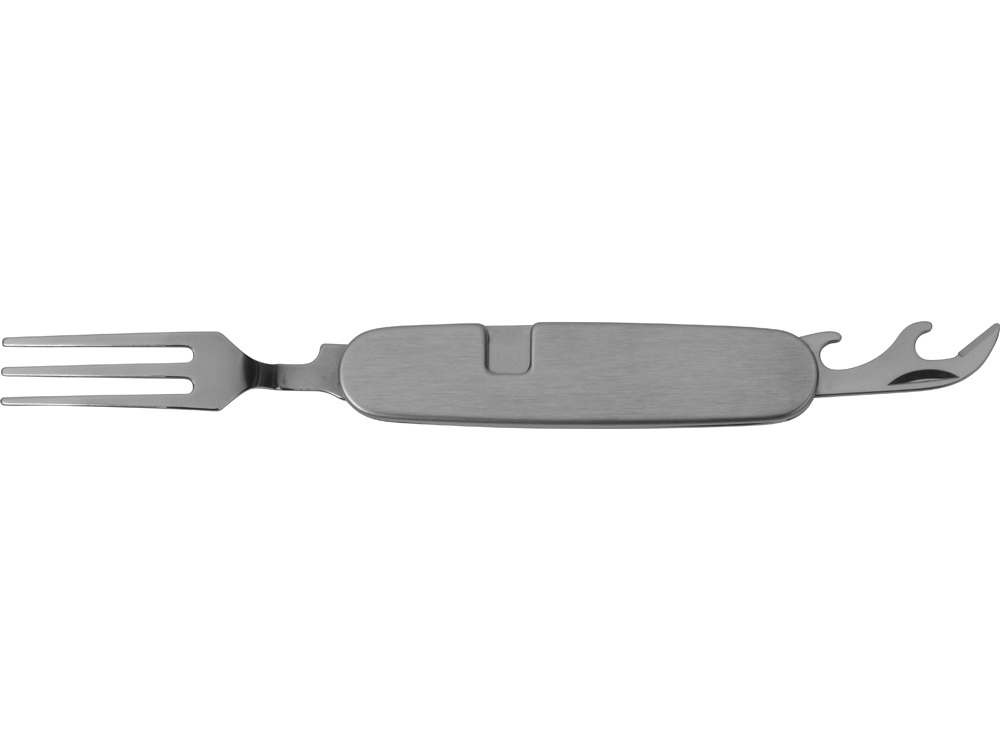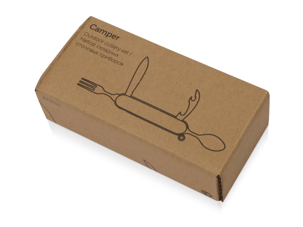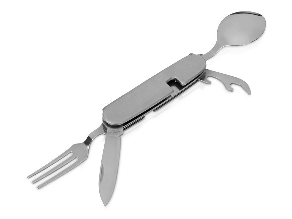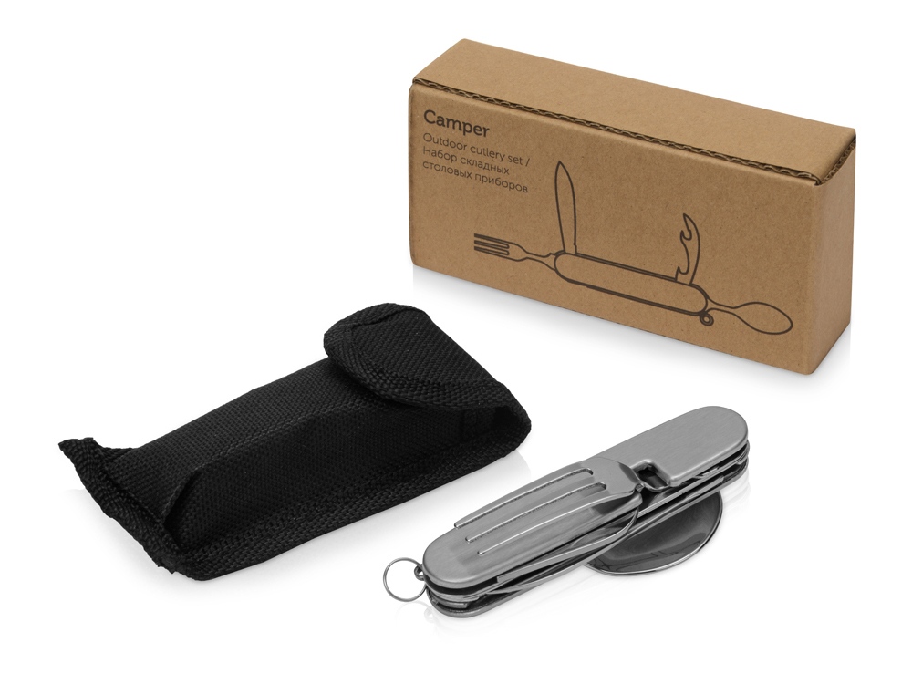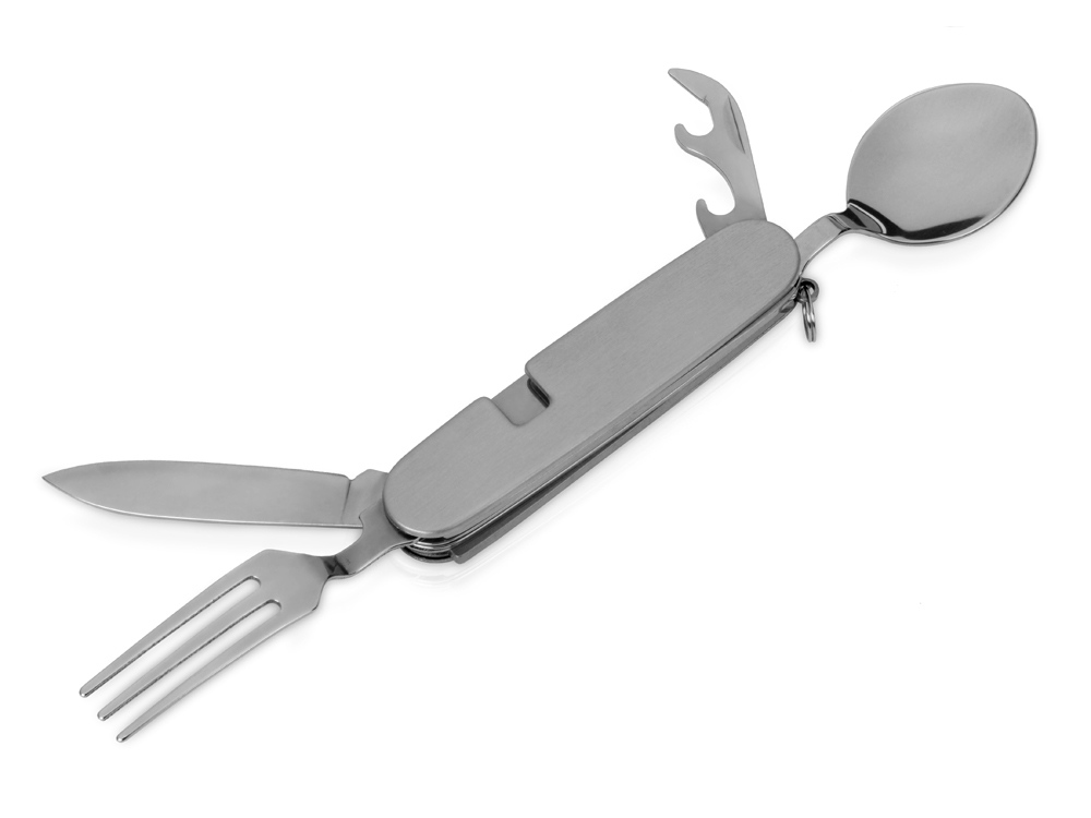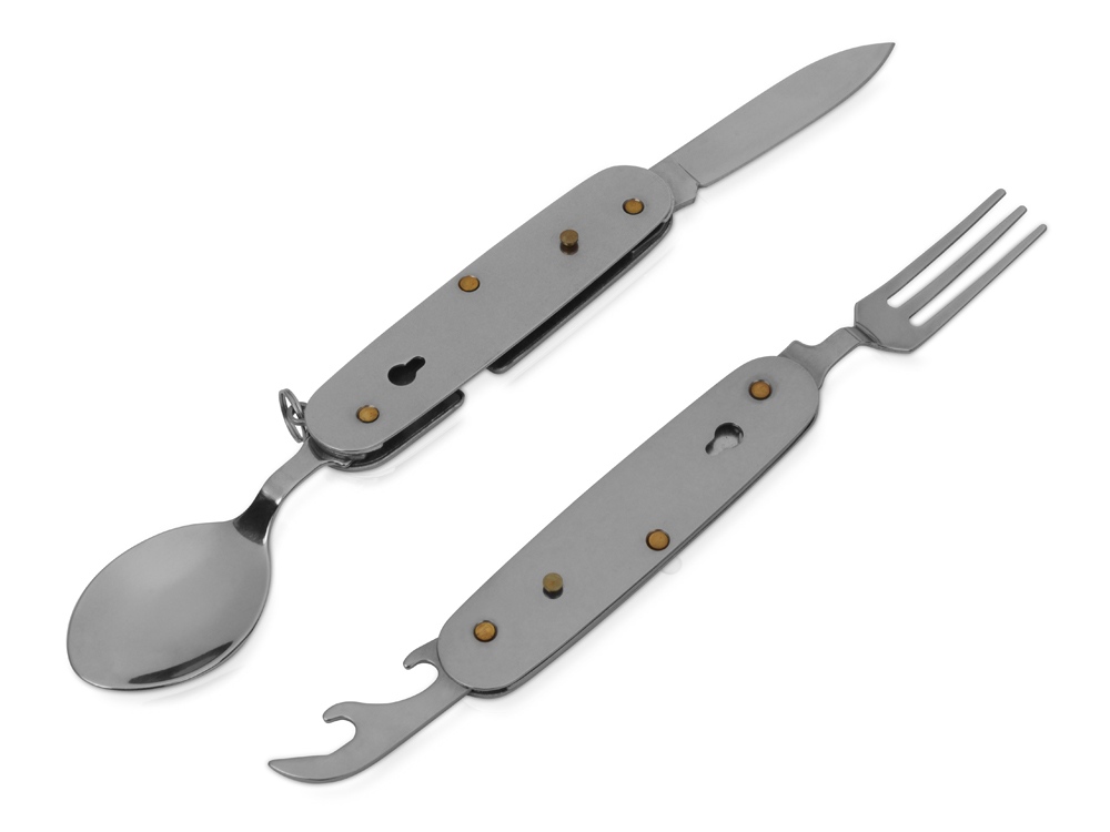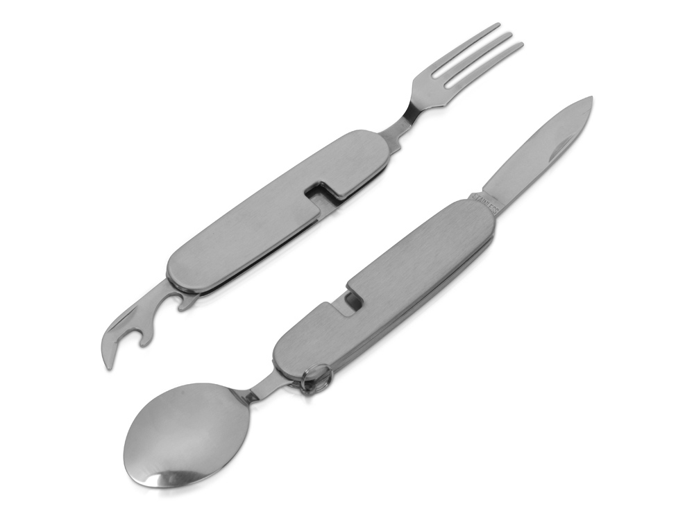 В нем есть все, что необходимо — ложка, вилка, ножик, открывалка бутылок и жестяных банок. Также имеется удобное кольцо для подвешивания. Набор разделяется на две части.