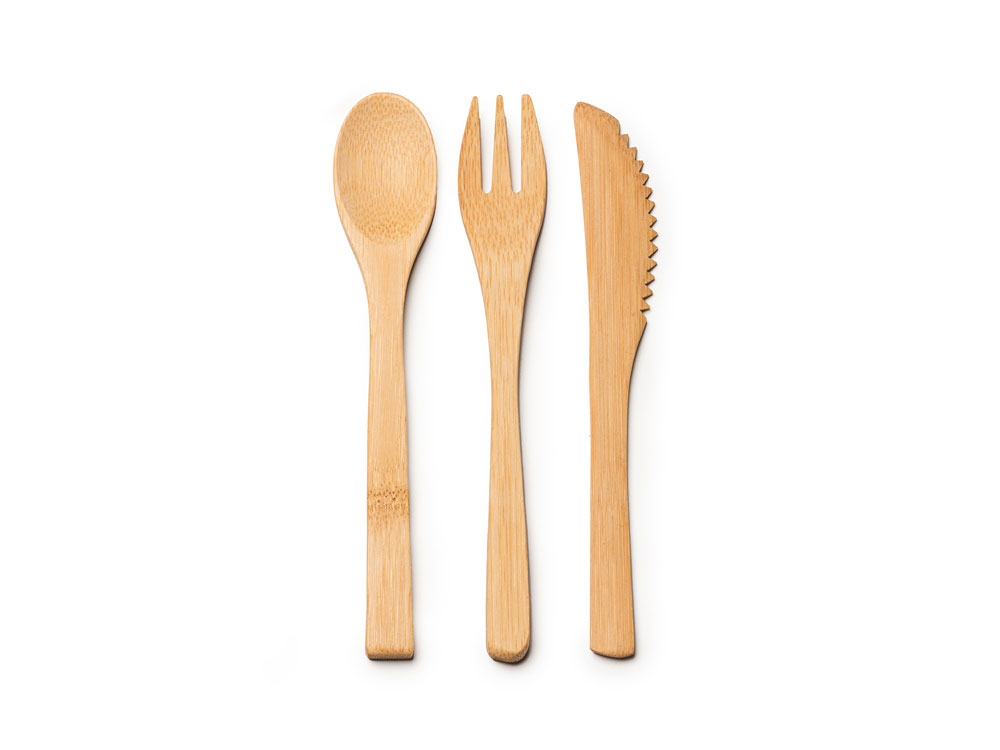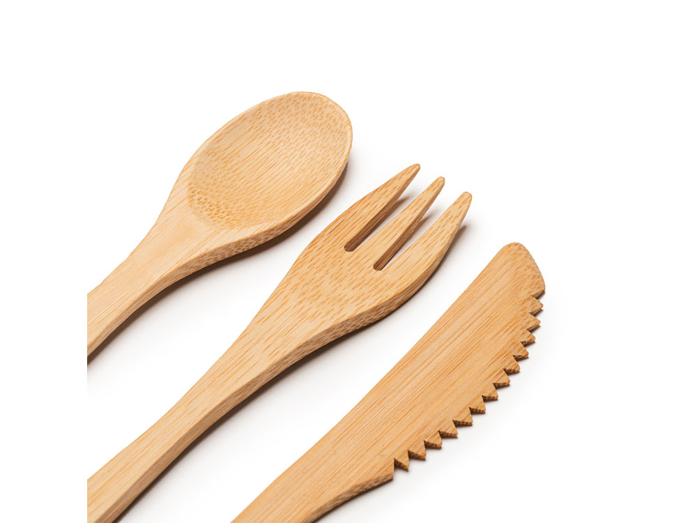 Набор столовых приборов из бамбука представлен в чехле из натурального хлопка. В комплекте вилка, нож и ложка. Идеально подходит для персонализации и продвижения вашего бизнеса.