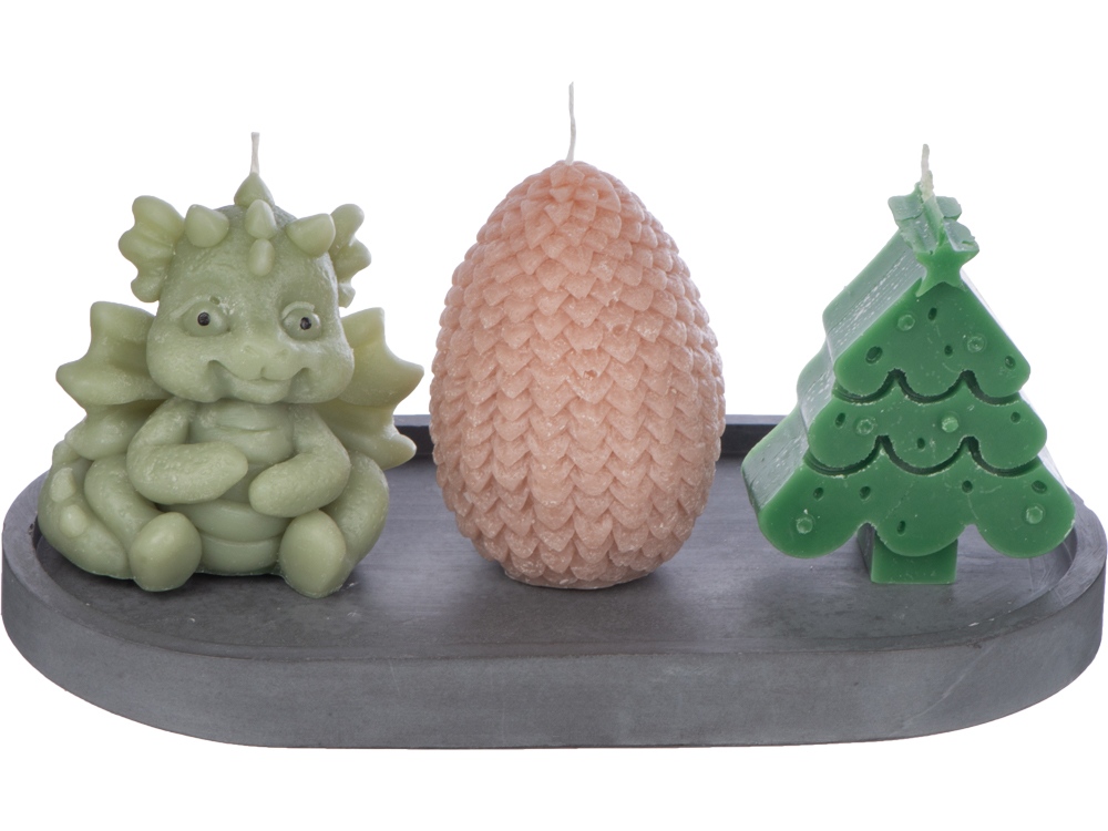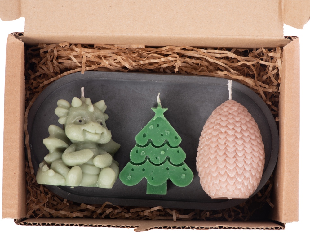 В набор входят три свечи на подставке — милый дракончик, яйцо и ёлка. Они подарят новогоднее настроение и ещё долго будут напоминать про год Дракона.