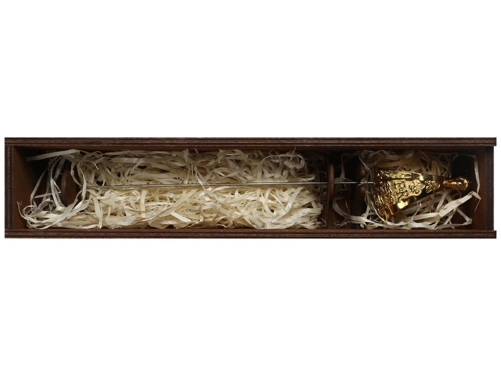 Набор поставляется в деревянном футляре, который достойным образом обрамляет подарок и, может быть, брендирован. Наполнитель и держатели-скобы из дерева, фиксирующие шпагу в одном положении, помогут доставить ее в целости и сохранности адресату, произведя должное впечатление с первого взгляда. Гравировка (оптоволоконный лазер) (Без чернения) на данный товар осуществляется бесплатно. Оплачивается только настройка оборудования в размере 1000 рублей на весь тираж.