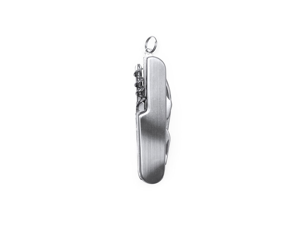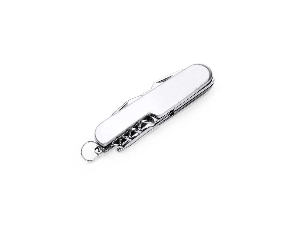Мультифункциональный нож из нержавеющей стали с 6 функциями: нож, открывалка для бутылок, консервный нож, штопор, отвертка и кольцо для ключей.