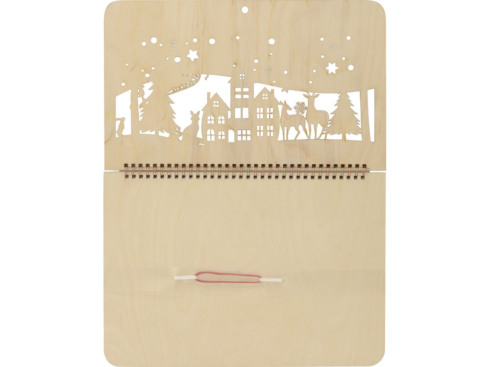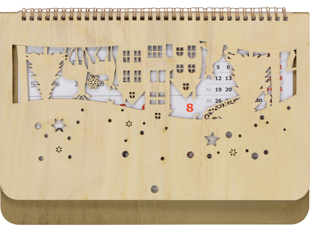 Настенный перекидной календарь имеет необычную «обложку», в роли которой выступают фанерные крышки. Нижняя крышка сплошная, верхняя — резная, ажурная, с вырезанным новогодним пейзажем и большим полем под нанесение логотипа или надписи, которая органично впишется в облик календаря.
