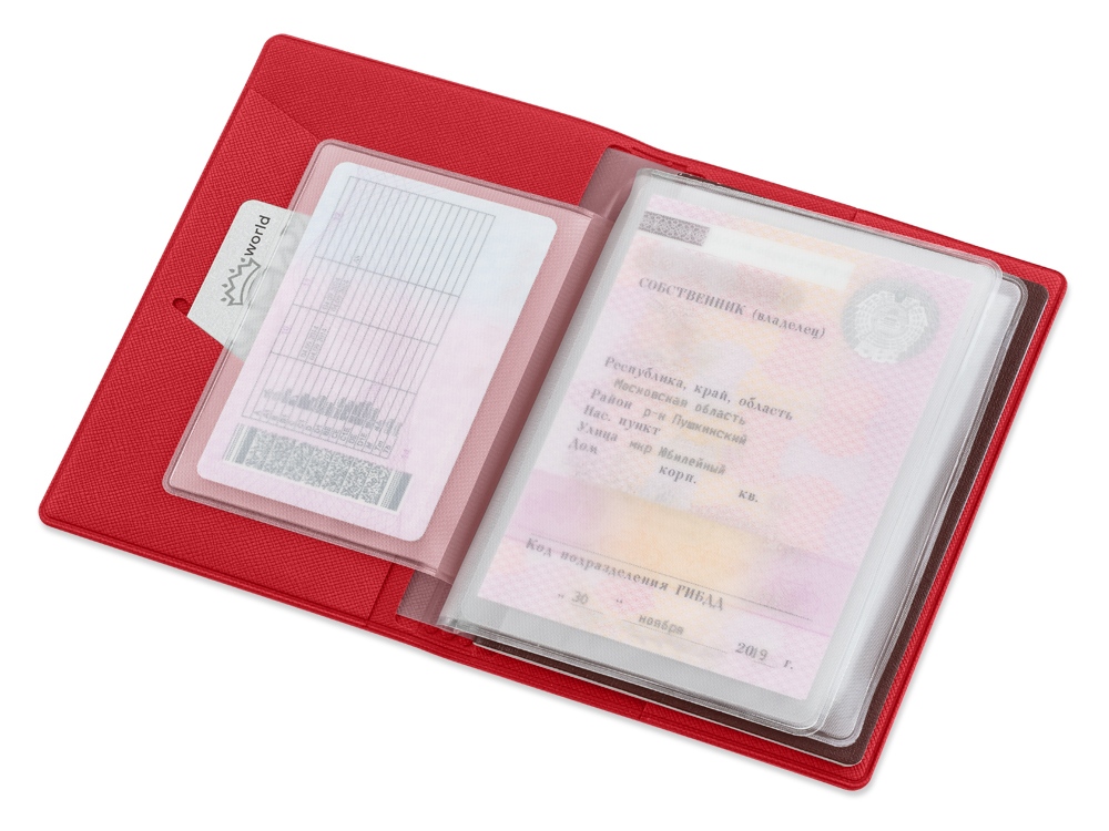 Внутренние вкладыши выполнены из пленки пвх и позволяют разместить: паспорт, свидетельство о регистрации тс, полис осаго, водительское удостоверение, также имеется кармашек для пластиковой карты. Тиснение (Блинт) на данный товар осуществляется бесплатно. Оплачивается только настройка оборудования в размере 6200 рублей на весь тираж.