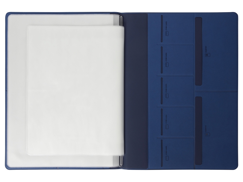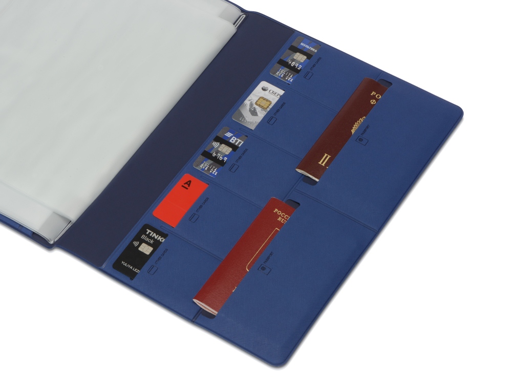 Обложка выполнена из экокожи, имеет внутренний слой из бархатистого материала и разбита на множество карманов: два больших кармана-отделения А4, 6 горизонтальных кармана с подписями и иконками, уточняющими тип документа, который можно поместить внутрь, пять карманов под визитки или кредитные карты. Тиснение (Блинт) на данный товар осуществляется бесплатно. Оплачивается только настройка оборудования в размере 6200 рублей на весь тираж.