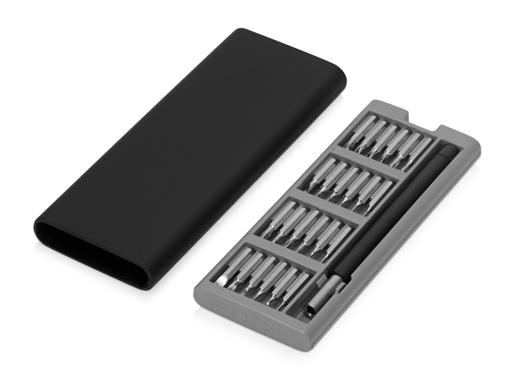 Отвертка с набором сменных насадок — лаконичная замена громоздкому комплекту отверток. 24 насадки для самых разных типов крепежа компактно хранятся в небольшом футляре, который удобно носить с собой. Замена насадки занимает считанные секунды. Минималистичный строгий дизайн превращает набор в функциональный бизнес-подарок. УФ-печать (УФ-печать цветные изделия) на данный товар осуществляется бесплатно. Оплачивается только настройка оборудования в размере 1800 рублей на весь тираж.