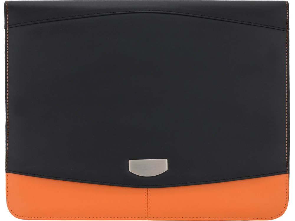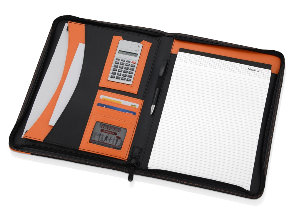 Стильная папка для документов Gabin – прекрасный подарок для делового человека. Папка формата А4 со сменным блокнотом и встроенным калькулятором. Сделана из искусственной кожи, особенно стильный вид ей придает цветная отделка внутри и снаружи. На металлический шильд можно нанести гравировку. Тиснение (Блинт) на данный товар осуществляется бесплатно. Оплачивается только настройка оборудования в размере 6200 рублей на весь тираж.
