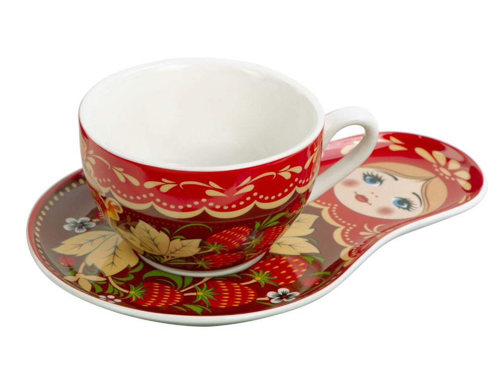 В наборе вы найдете необычную чайно-кофейную пару с подставкой в виде русской «Матрешки», которая является одним из главных символов России и варенье из ели и мяты.