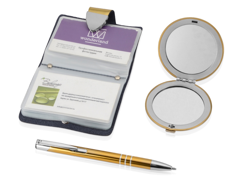 | Комплектность | шариковая ручка, зеркало, визитница |