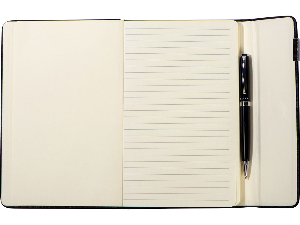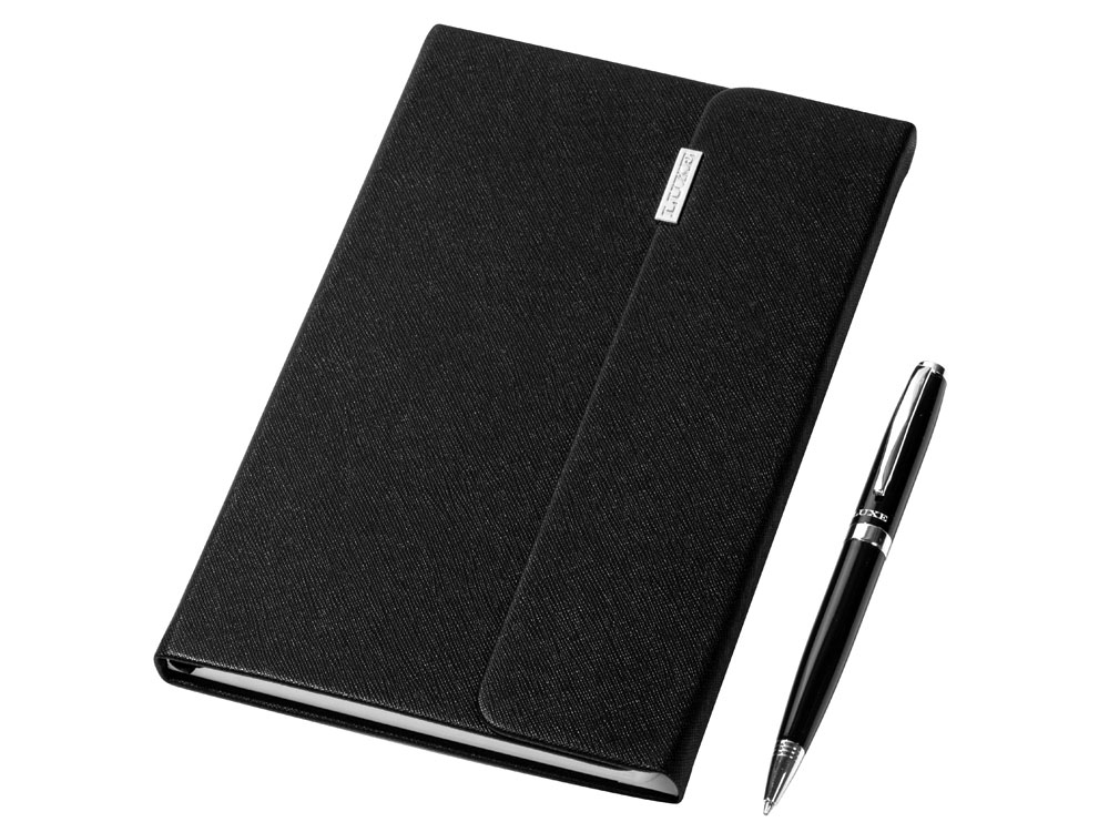Эксклюзивный блокнот формата A5 с обложкой из термополиуретана, черной лентой-закладкой, застежкой на магните и 80 линованными листами (80 г/м²) кремового цвета. Предлагается с шариковой ручкой. Тиснение (Блинт) на данный товар осуществляется бесплатно. Оплачивается только настройка оборудования в размере 6200 рублей на весь тираж.
