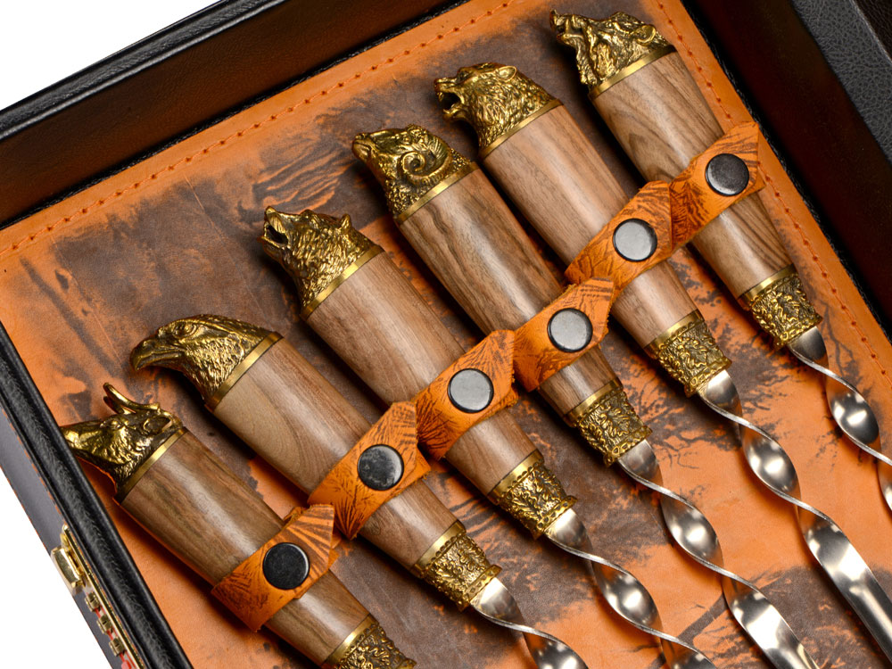Шампура 670 мм (нерж. сталь) ручка орех, бронзовое литье– 6 шт. Гравировка (оптоволоконный лазер) (Без чернения) на данный товар осуществляется бесплатно. Оплачивается только настройка оборудования в размере 1000 рублей на весь тираж.