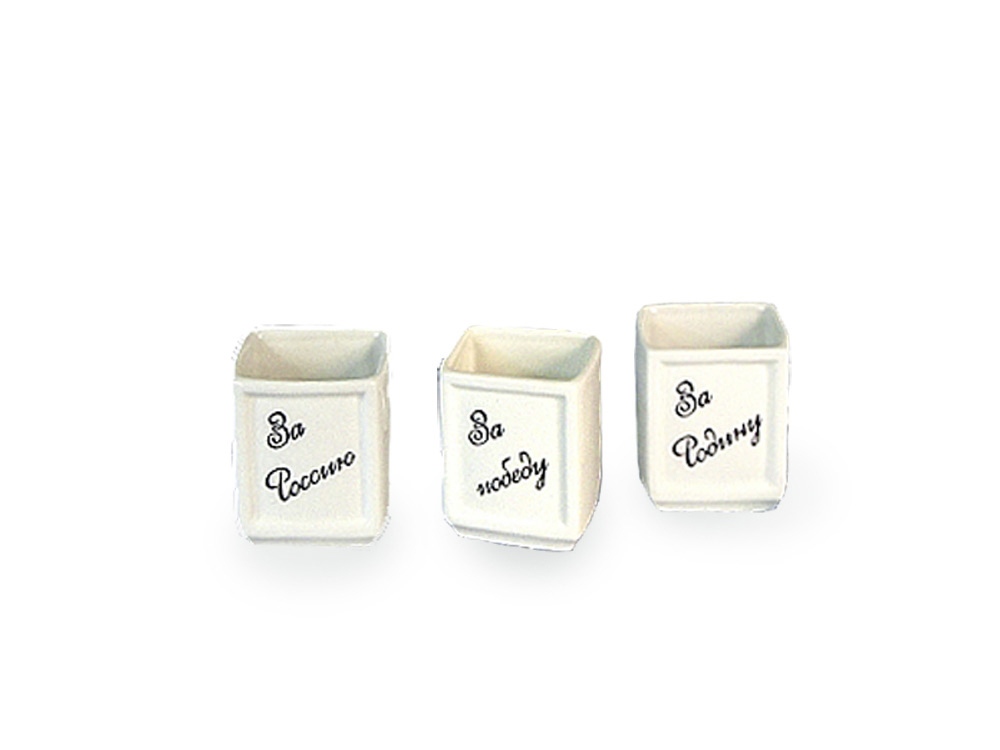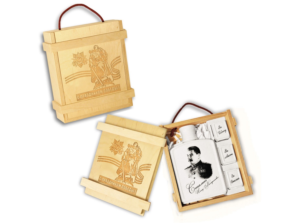 Набор упакован в деревянную коробку “С Праздником Победы” с изображением главных символов праздника. Подарочный набор состоит из штофы с изображением генералиссимуса И. В. Сталина и трех рюмок с патриотическими тостами “За Сталина”, “За Родину”, “За совесть”. Все сувениры выполнены из высококачественной керамики, поэтому они еще долго будут служить и радовать глаз. Этот подарочный набор станет прекрасным дополнением к праздничному столу.