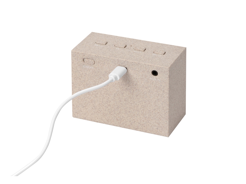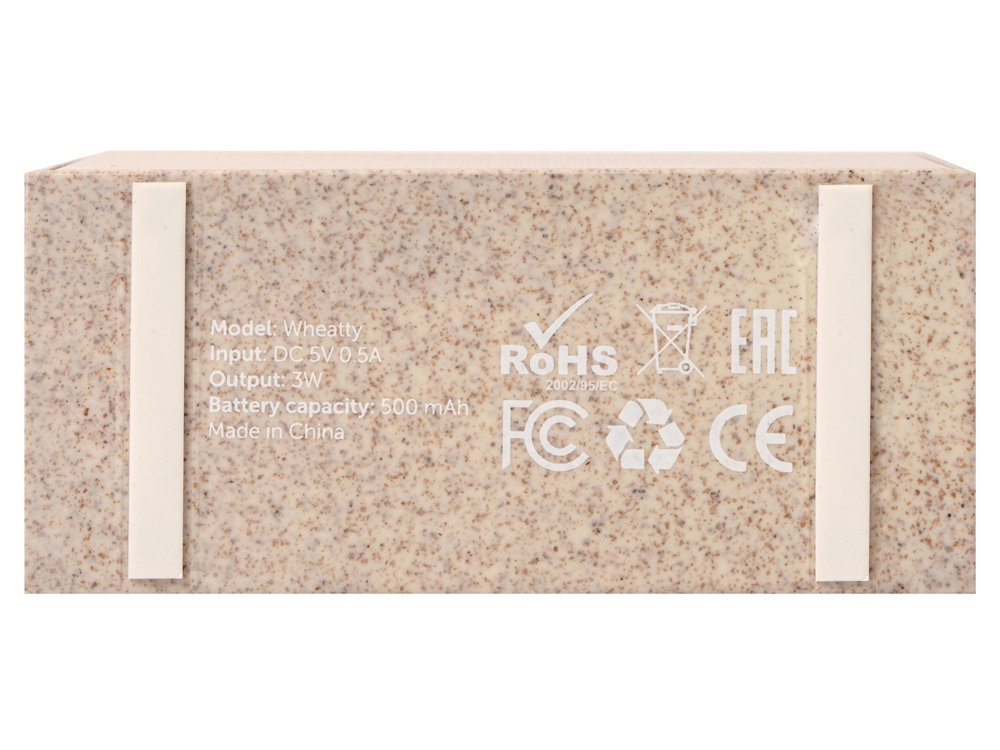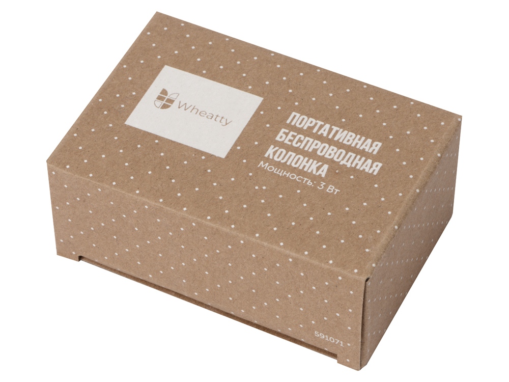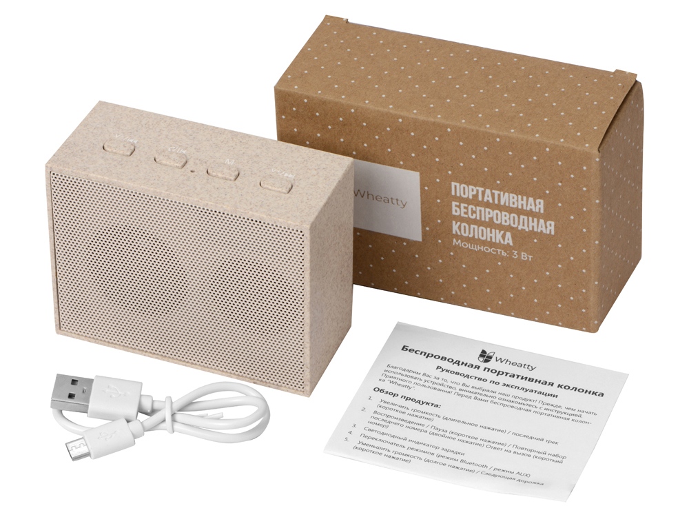 Беспроводная колонка «Wheatty» на 35% состоит из переработанной пшеничной соломы, что является положительным примером сокращения производства и потребления пластика в мире. Воспроизводит музыку в течение 3-х часов. Мощность 3 Вт. В колонке предусмотрены кнопки управления и линейный вход (AUX). Компактная колонка с быстрым подключением (Bluetooth 5.0). Поставляется в крафт упаковке из переработанной бумаги. Тампопечать (1 цвет (цветные изделия)) на данный товар осуществляется бесплатно. Оплачивается только настройка оборудования в размере 4000 рублей на весь тираж.