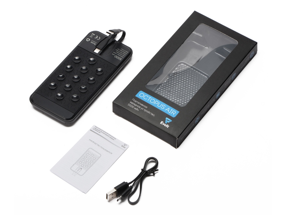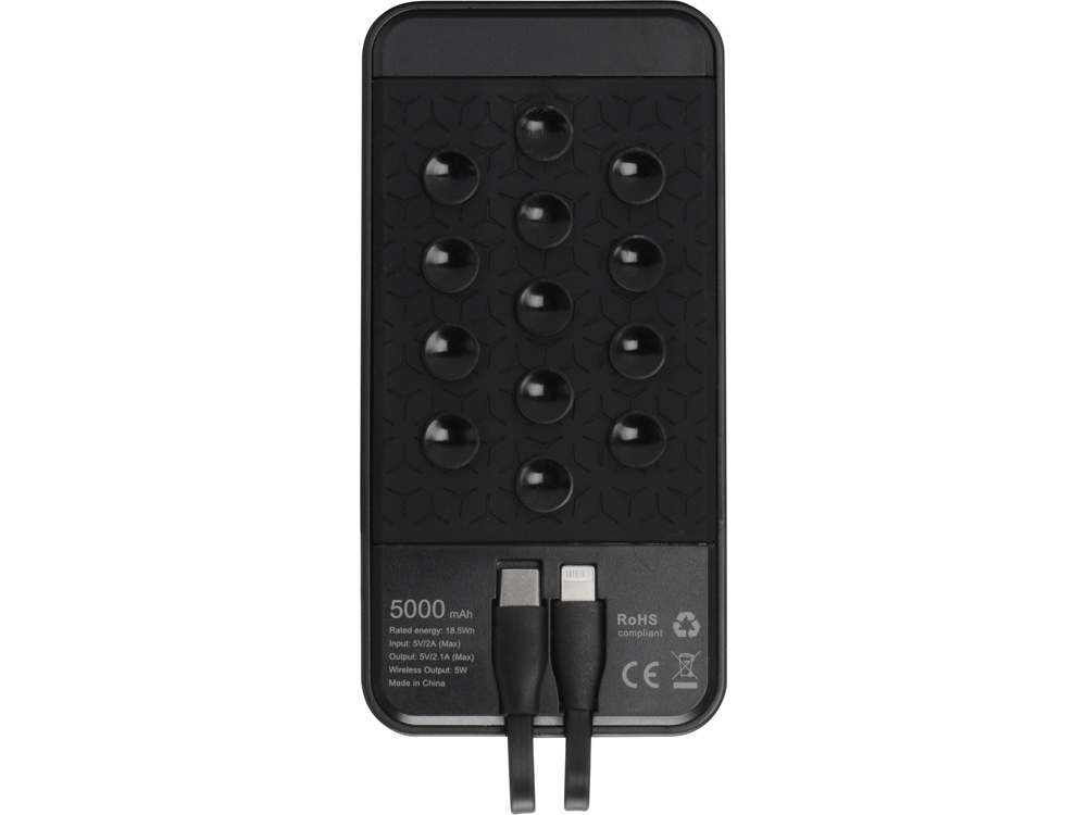 Универсальный внешний аккумулятор с функцией беспроводной зарядки. Имеет 2 встроенных кабеля USB-C и Lightning, также есть отдельный зарядный кабель micro USB в комплекте. На корпусе имеются присоски для надежного крепления к смартфону.