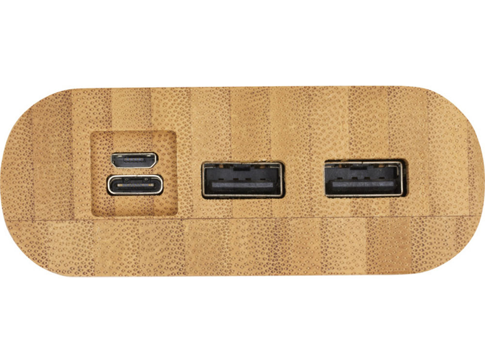 Портативное зарядное устройство емкостью 20 000 мАч из бамбука с сенсорной кнопкой включения/выключения и 4 светодиодными индикаторами для отображения оставшейся емкости батареи. Вход Micro USB 5 В/2 А, вход Type-C 5 В/3 А, выход Type-C 5 В/3.1 А макс., двойной выход USB-A 5 В/3.1 А макс., общая мощность 15.5 Вт. Поставляется с зарядным кабелем Type-C — Type-C 3 А из термополиэтилена длиной 30 см, инструкцией по эксплуатации и подарочной коробкой из крафт-бумаги. Поскольку бамбук — природный материал, цвет и размер сырья могут быть разными, что, в свою очередь, может повлиять на итоговый вид печати.