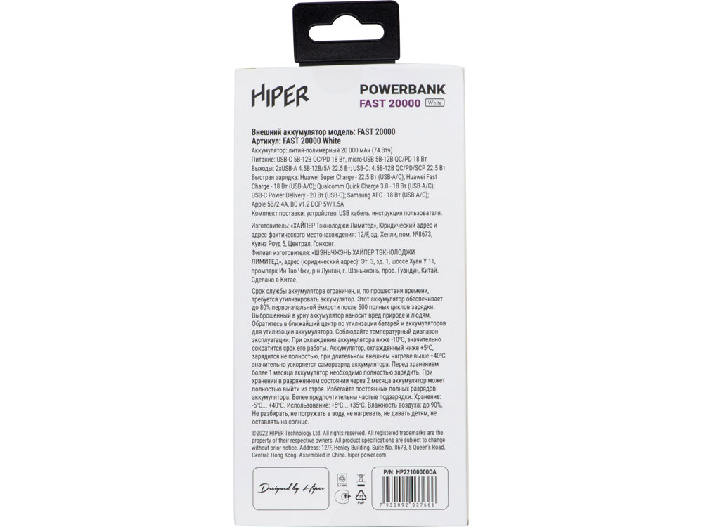 Портативный внешний аккумулятор HIPER FAST 20000 емкостью 20000 мАч (74Втч) оснащён двунаправленным портом USB-C, Micro-USB входом для зарядки, с поддержкой быстрой зарядки аккумулятора QC и PD, 2xUSB-A выходами, максимальный выходной ток 5А, максимальная мощность 22,5 Вт, поддержка быстрой зарядки стандарта QC 18 Вт, поддержка быстрой зарядки стандарта PD 18 Вт, стильный дизайн. Тампопечать (1 цвет (цветные изделия)) на данный товар осуществляется бесплатно. Оплачивается только настройка оборудования в размере 4000 рублей на весь тираж.