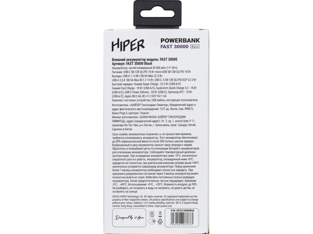 Портативный внешний аккумулятор HIPER FAST 30000 емкостью 30000 мАч (111Втч) оснащён двунаправленным портом USB-C, Micro-USB входом для зарядки, с поддержкой быстрой зарядки аккумулятора QC и PD, 4xUSB-A выходами, максимальный выходной ток 5А, максимальная мощность 22,5 Вт, поддержка быстрой зарядки стандарта QC 18 Вт, поддержка быстрой зарядки стандарта PD 18 Вт, стильный дизайн. Тампопечать (1 цвет (белые изделия)) на данный товар осуществляется бесплатно. Оплачивается только настройка оборудования в размере 4000 рублей на весь тираж.