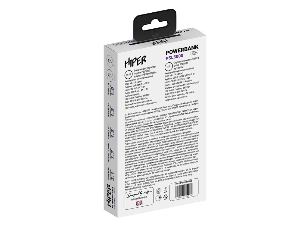 Портативный внешний литий-ион полимерный аккумулятор HIPER PSL5000 White емкостью 5000 мАч (18,5Втч) оснащён входом USB-C для зарядки, Micro-USB входом для зарядки, 2xUSB-A выходами, максимальный выходной ток 2,1А, максимальная мощность 12 Вт, тонкий корпус. Тампопечать (1 цвет (белые изделия)) на данный товар осуществляется бесплатно. Оплачивается только настройка оборудования в размере 4000 рублей на весь тираж.