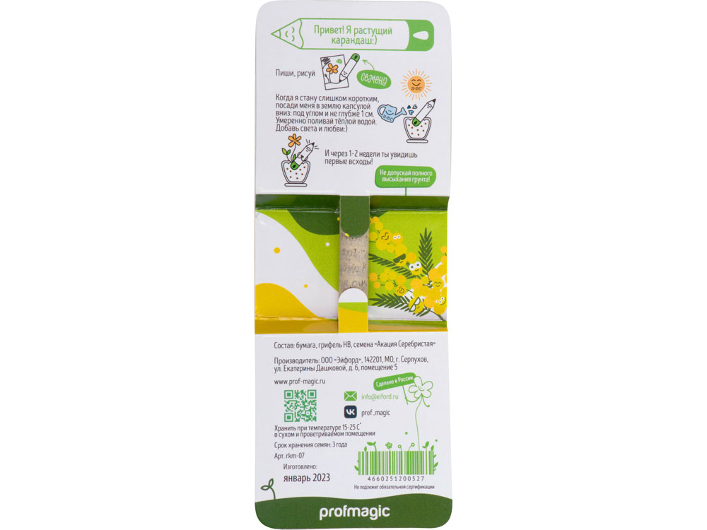 Принцип работы такой же, как и у больших карандашей: пишите карандашом до тех пор, пока не останется 1 см до капсулы. Когда он станет коротким, посадите его под углом, погрузив капсулу в землю не более, чем на 1 см. Поливайте и ухаживайте за ним, и уже через 15-25 дней акация даст первые всходы. Тампопечать (1 цвет) на данный товар осуществляется бесплатно. Оплачивается только настройка оборудования в размере 4000 рублей на весь тираж.