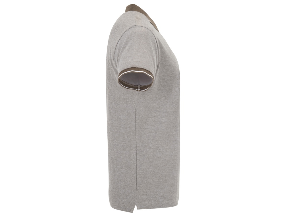 Рубашка поло с коротким рукавом. Манжеты и воротник из однотонного риба 1х1 с контрастными полосками. Планка на 3 пуговицы. Низ с боковыми разрезами, отделанными тесьмой. Спинка немного длиннее полочки. Полотно с меланжевым эффектом. Трафаретная печать (1 цвет (цветные изделия)) на данный товар осуществляется бесплатно. Оплачивается только настройка оборудования в размере 8700 рублей на весь тираж.