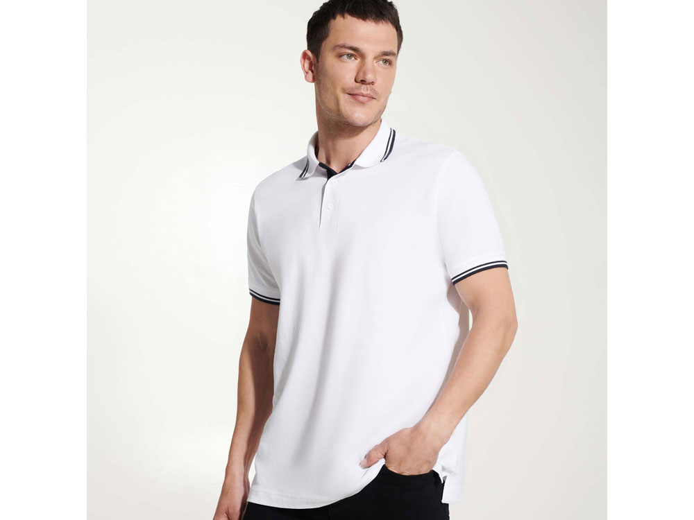 Поло с коротким рукавом. Воротник и манжеты из риба 1х1 с отделкой двойной контрастной плоской. Внутренняя планка контрастного цвета, застежка на 3 пуговицы. Разрезы в боковых швах. Премиальное плотное пике 230 гр. Трафаретная печать (1 цвет (белые изделия)) на данный товар осуществляется бесплатно. Оплачивается только настройка оборудования в размере 5300 рублей на весь тираж.