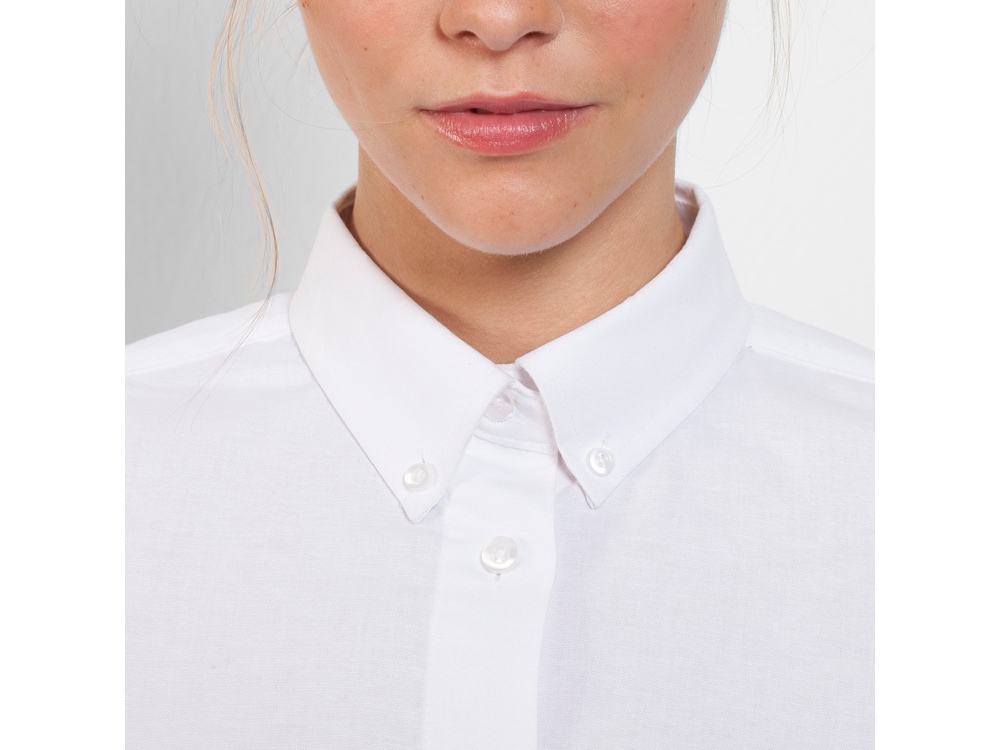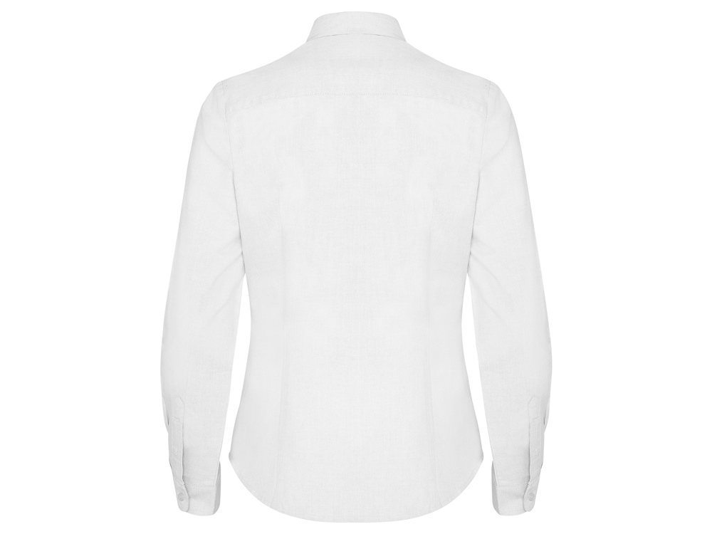 Женская рубашка с длинным рукавом, накладной карман слева. Планка на пуговицах. Отложной воротник на стойке продублирован пуговицами. Манжета регулируется по ширине с помощью 2-х пуговиц. Кокетка на спинке. Прилегающий силуэт.
