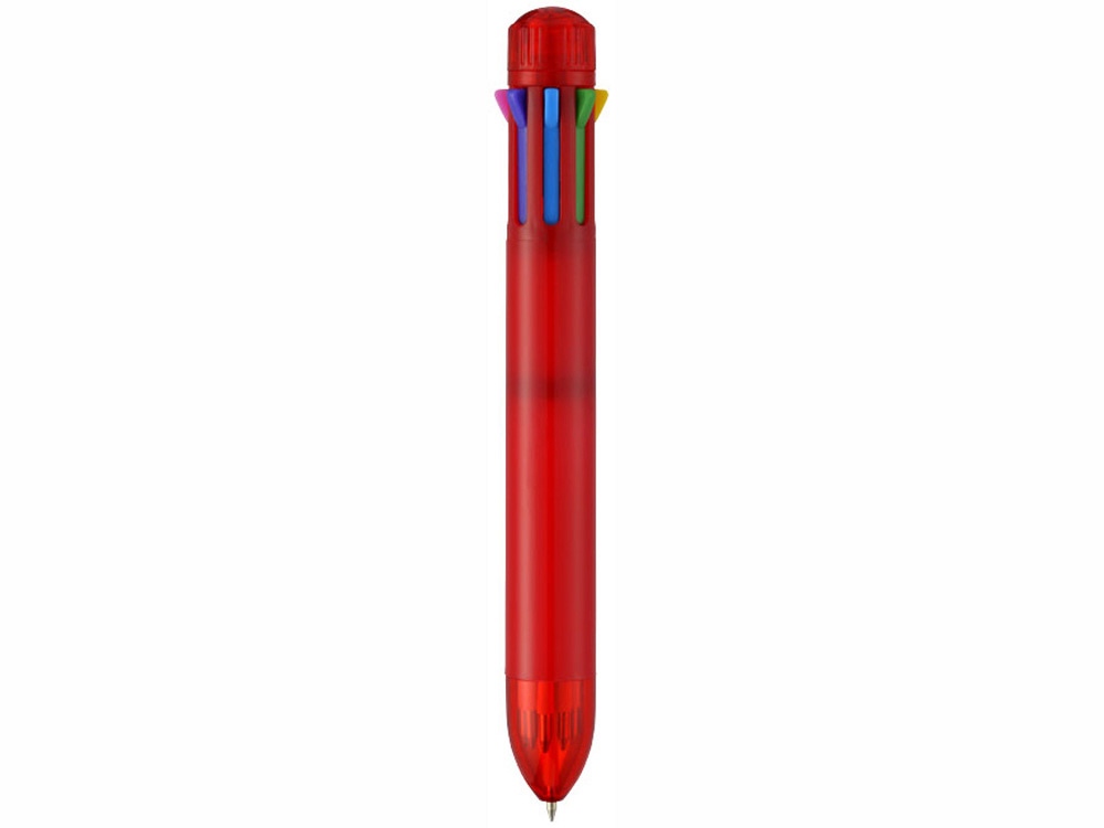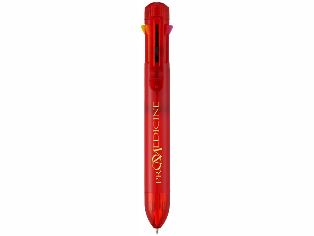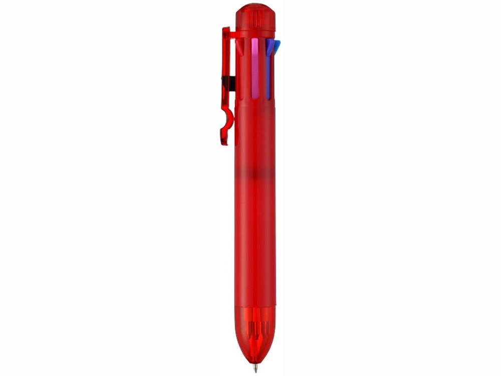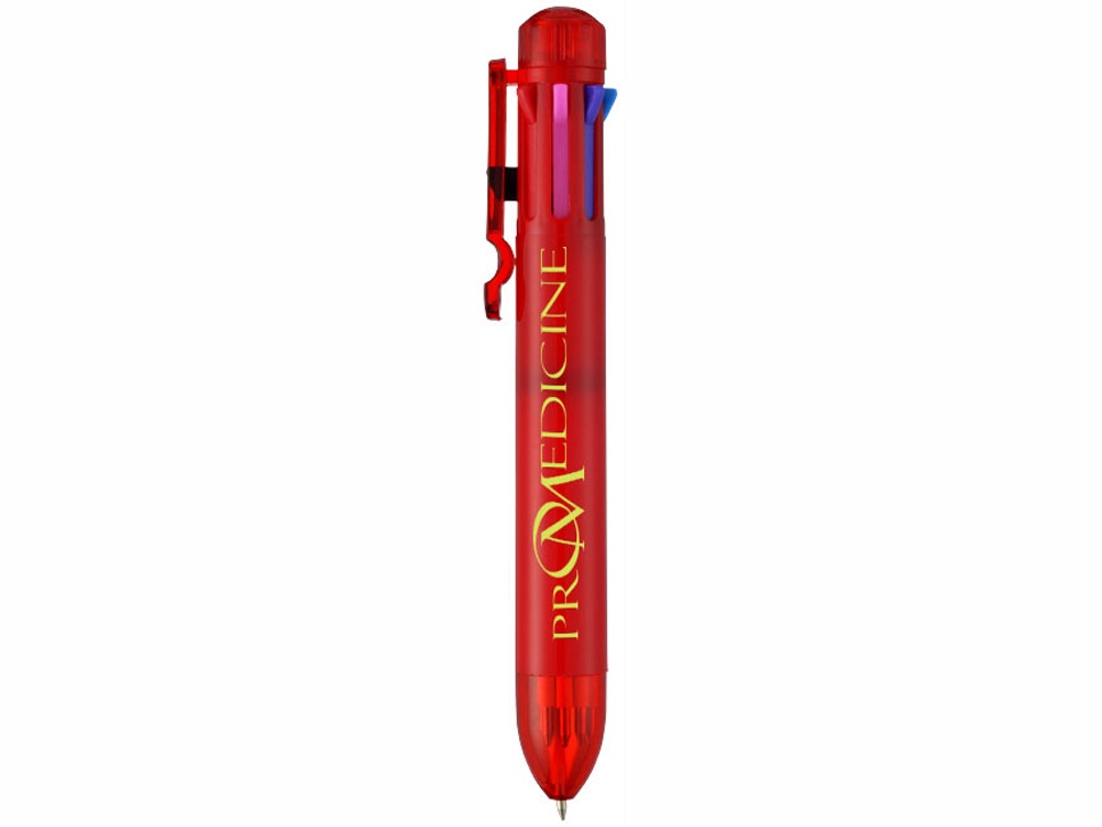 Многостержневая шариковая ручка с кнопочным механизмом и стержнями 8 различных цветов: черным, синим, зеленым, оранжевым, розовым, фиолетовым, красным и желтым. Тампопечать (1 цвет (цветные изделия)) на данный товар осуществляется бесплатно. Оплачивается только настройка оборудования в размере 3600 рублей на весь тираж.