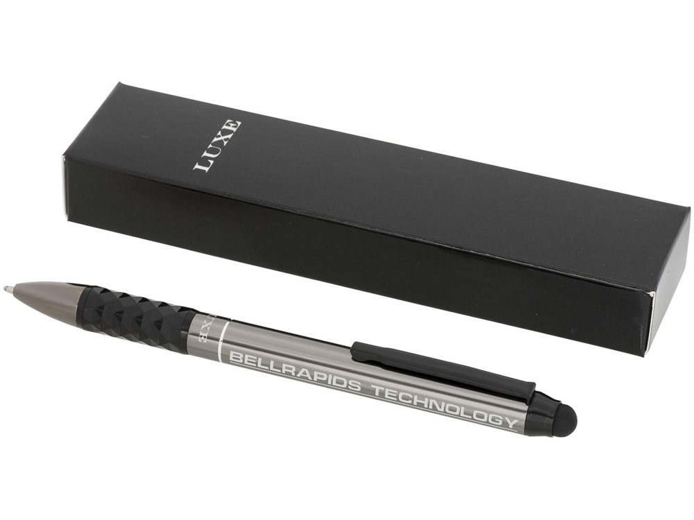 Шариковая ручка-стилус. В этой шариковой ручке-стилусе сочетается элегантность и надежность. Корпус дополнен нижней частью из приятного на ощупь материала. Алюминий. Гравировка (оптоволоконный лазер) (Без чернения) на данный товар осуществляется бесплатно. Оплачивается только настройка оборудования в размере 1000 рублей на весь тираж.