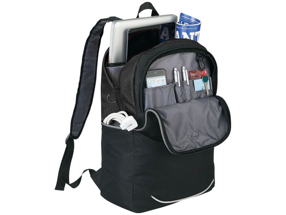 Рюкзак Benton для ноутбука 17″. Рюкзак для ноутбука 17″Benton с большим основным отделением на молнии и карманом для планшета. Большой передний карман с отверстием для наушников, органайзером для ручек, визиток, технических аксессуаров и других мелочей. Ручка сверху и регулируемые плечевые ремни. 600D полиэстер. Термотрансфер (1 цвет (цветные изделия)) на данный товар осуществляется бесплатно. Оплачивается только настройка оборудования в размере 9200 рублей на весь тираж.
