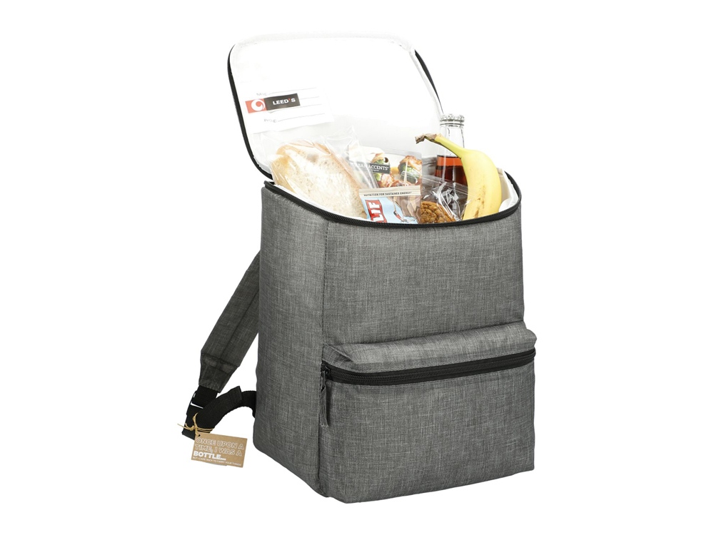 Рюкзак-холодильник из переработанного пластика вмещает 20 банок по 0,33 л. Спереди карман на молнии. Сбоку сетчатый карман. Лямки регулируются по длине. Термотрансфер (1 цвет (цветные изделия)) на данный товар осуществляется бесплатно. Оплачивается только настройка оборудования в размере 9200 рублей на весь тираж.