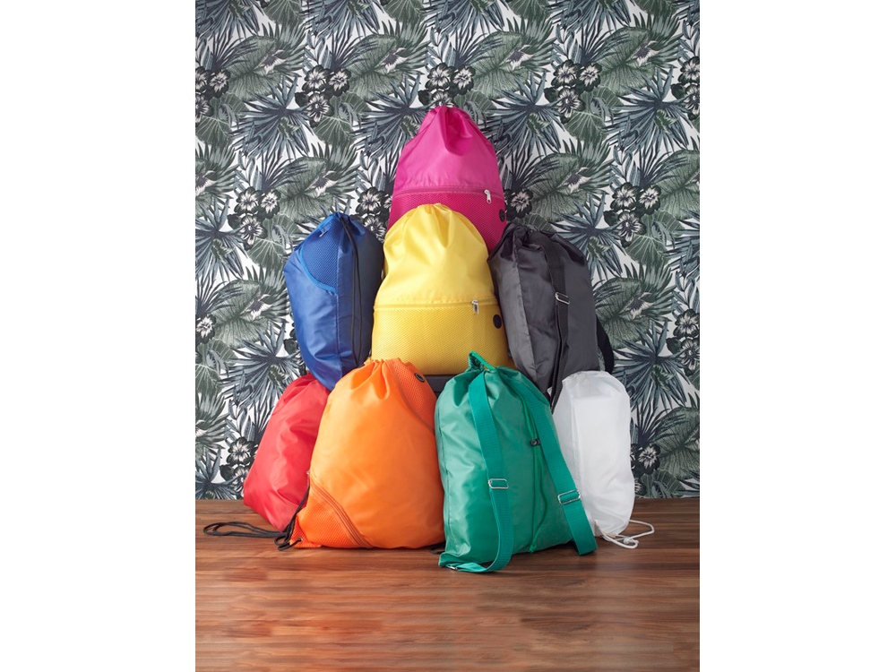 Рюкзак со шнурком и главным отделением на шнуровке в цвет изделия. Имеет 2 небольших сетчатых передних кармана (1 на молнии и 1 на липучке) и порт для наушников. Прочность до 5 кг.