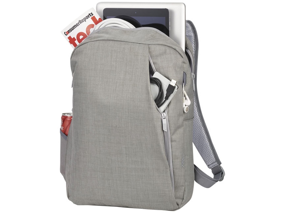 Рюкзак Zip для ноутбука 15″. Гладкая ткань с серо/серебряными акцентами. Подкладка с лого Zoom® и отверстие для шнура. Основное отделение с карманом для ноутбука до 15,6″. Карман из сетки и два дополнительных кармана для повербанка или телефона. Уплотненная спинка и шлейки, стропа для крепления к чемодану. Брендинг Zoom® и акценты. Полиэстер 210D. Термотрансфер (1 цвет (цветные изделия)) на данный товар осуществляется бесплатно. Оплачивается только настройка оборудования в размере 9200 рублей на весь тираж.