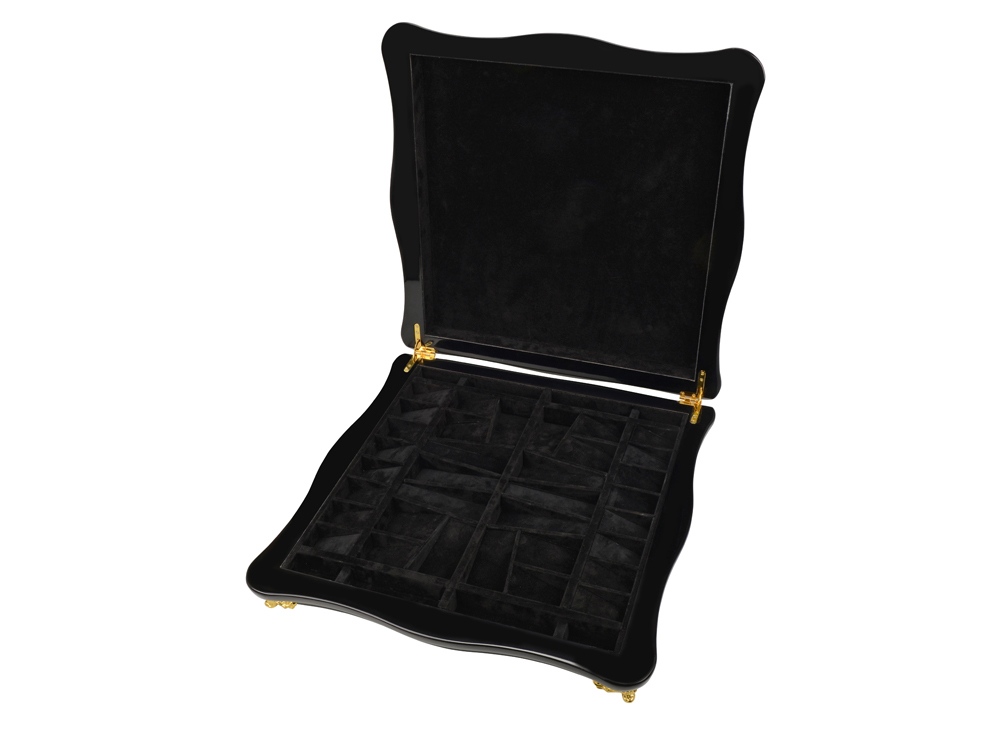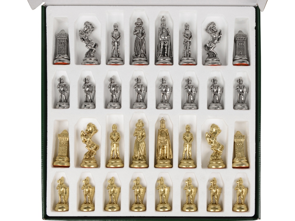 Фигурки выполнены в стилистике времен и изготовлены из цинкового сплава “замак” с посеребрением и позолочением. Шахматная доска представляет собой фрагмент цельного каучукового дерева. Игровое поле 41 х 41 см. Набор упакован в две картонные коробки. На оборотной стороне шахматной доски имеется бархатное покрытие и углубления, в которые можно складывать фигуры. Окунитесь в старинную эпоху Карла IV вместе с нашим эксклюзивным подарком.