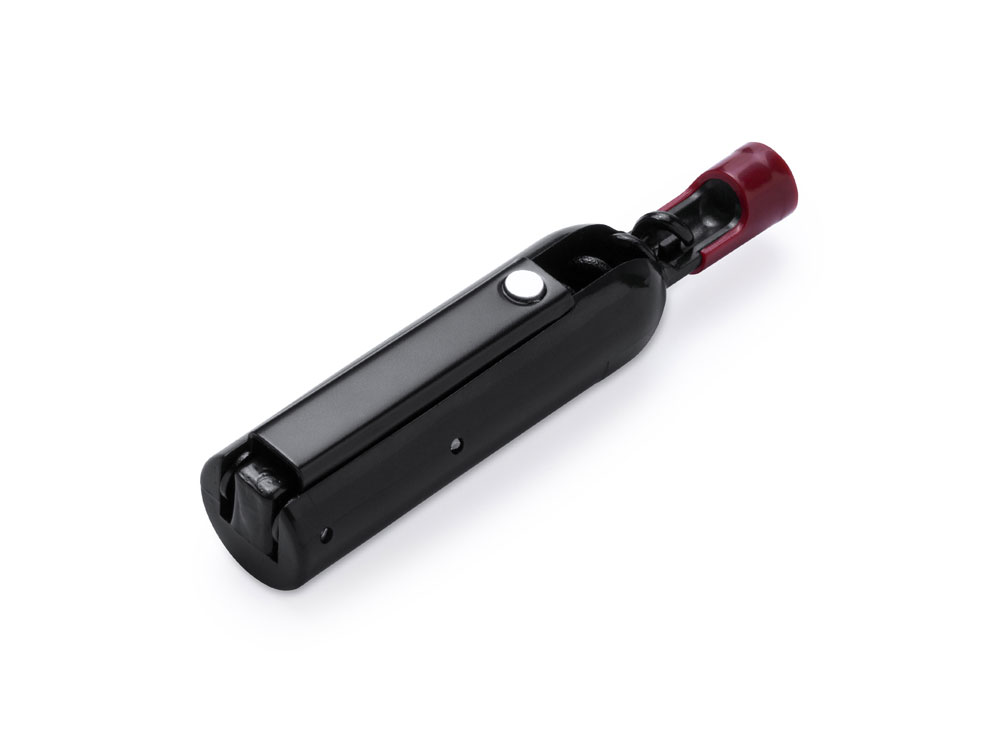 Металлический штопор в форме бутылки, изготовленный из пластика PS. Поставляется в белой упаковке.