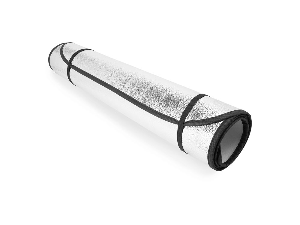 Прямоугольный автомобильный солнцезащитный козырек с алюминиевой передней частью и белой пенопластовой задней частью. Два металлических люверса в обоих верхних углах для присосок. Черная окантовка и эластичные лямки для складывания.