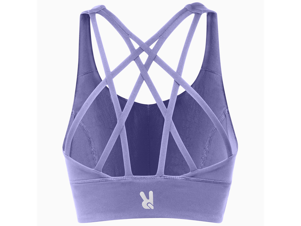 Спортивный женский топ с высокой поддержкой. Спинка·борцовка. Усиленная эластичная резинка под бюстом. Двойная ткань и подкладка. Съемные чашечки. Светоотражающий логотип Roly на спине.