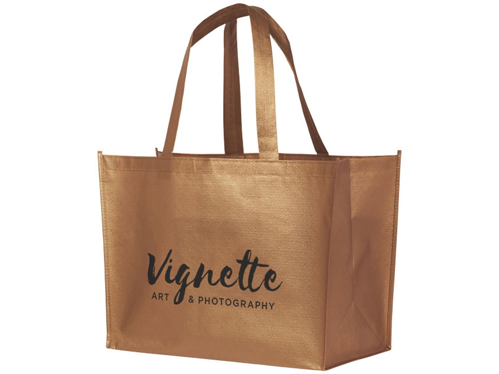 Ламинированная сумка-шоппер Alloy. Легкая, гибкая ламинированная, блестящая сумка-шоппер. Сделана из ламинированного нетканого полипропилена (80 г). Высота ручек 24 см. Трафаретная печать (1 цвет (лучшая цена!) *) на данный товар осуществляется бесплатно. Оплачивается только настройка оборудования в размере 4700 рублей на весь тираж.