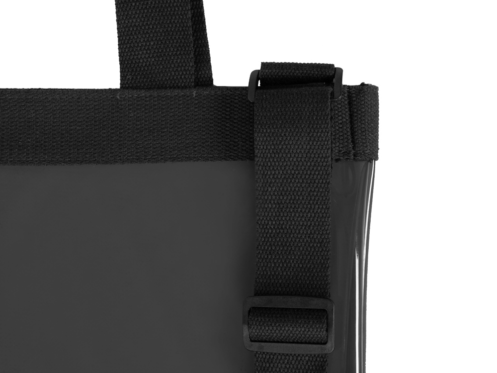 Легкая и вместительная сумка из прозрачного пластика с длинной лямкой из парусины, регулирующейcя по длине, незаменима для шоппинга или путешетсвий. Для большего удобства у сумки есть 2 короткие ручки. Трафаретная печать (1 цвет (цветные изделия)) на данный товар осуществляется бесплатно. Оплачивается только настройка оборудования в размере 8700 рублей на весь тираж.